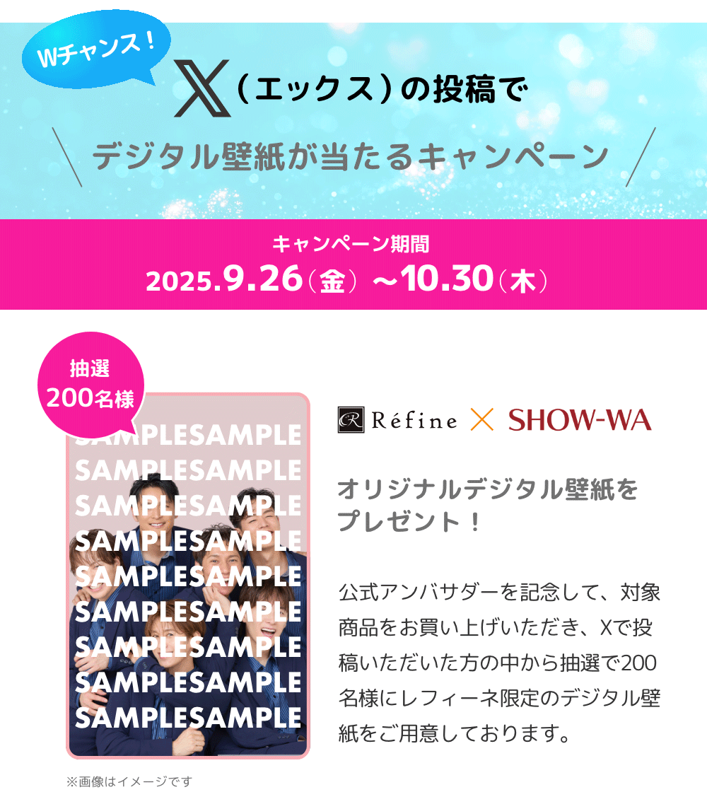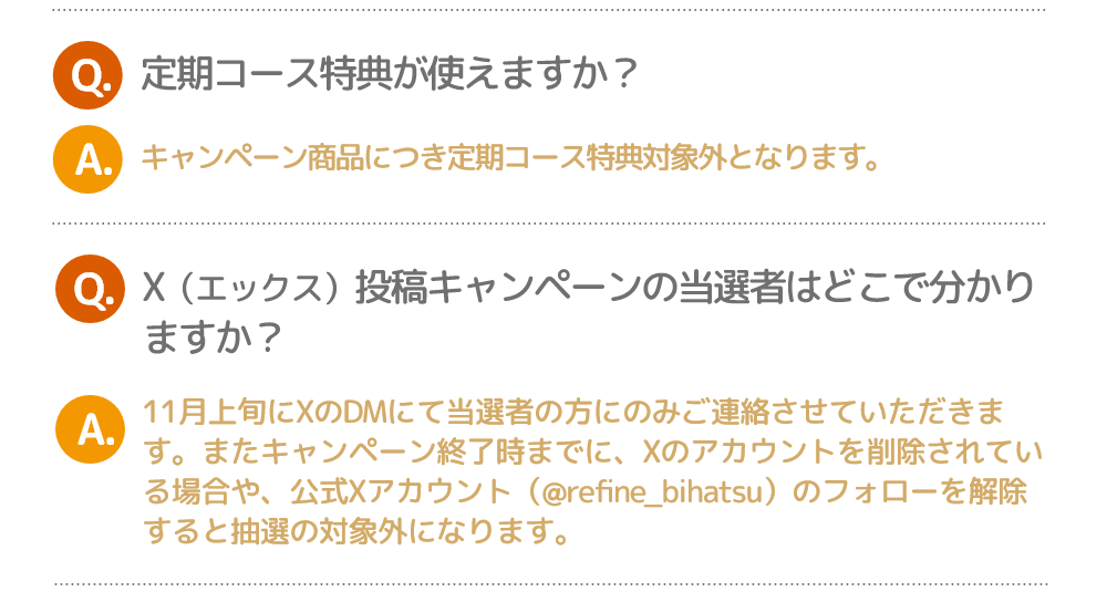 ・キャンペーン終了時までに、Xのアカウントを削除されている場合や、公式Xアカウント(@refine_bihatsu)のフォローを解除すると対象外になります。